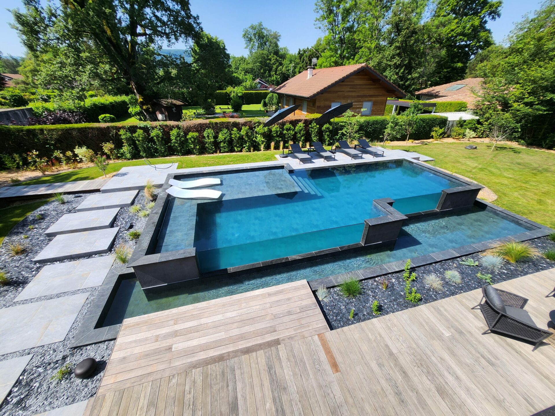 Pour un rendu harmonieux, nous associons la piscine à un aménagement extérieur sur mesure : terrasses en bois, pierres naturelles, végétation adaptée.