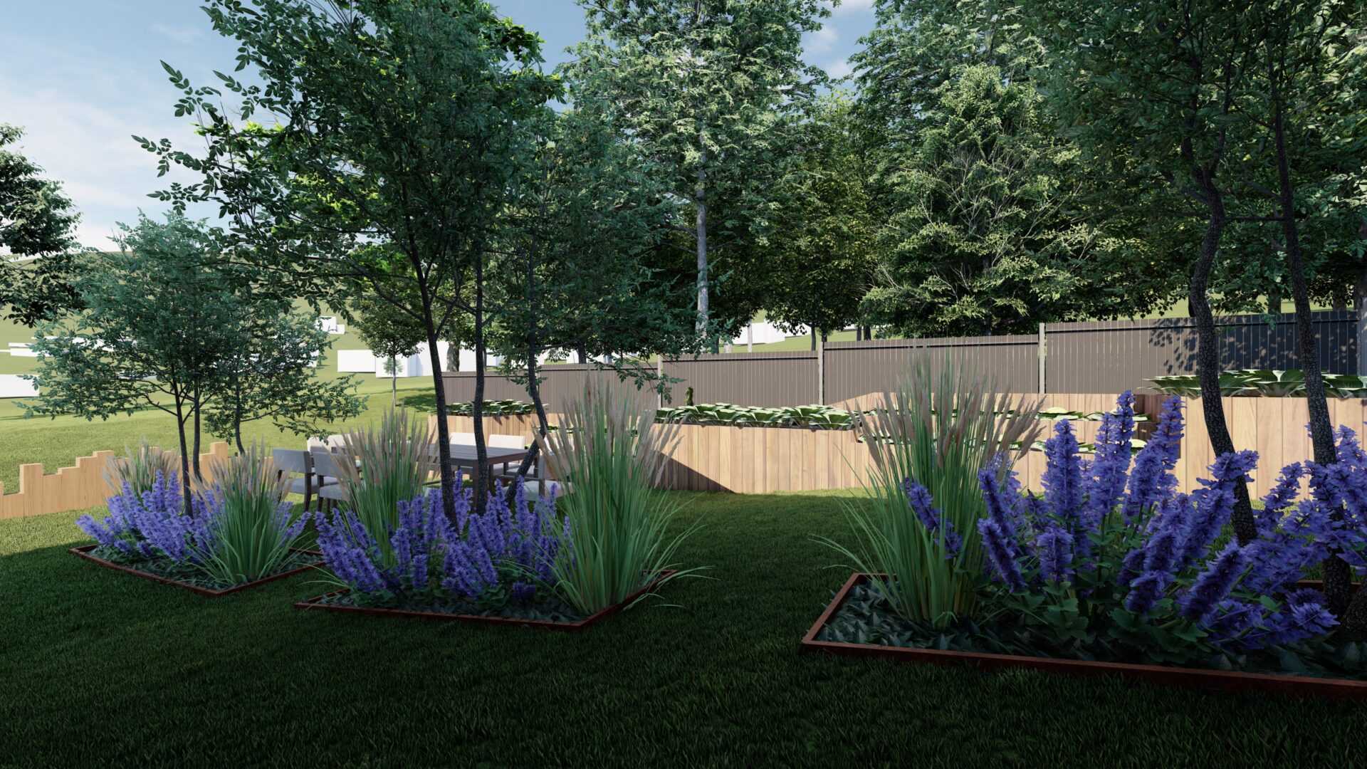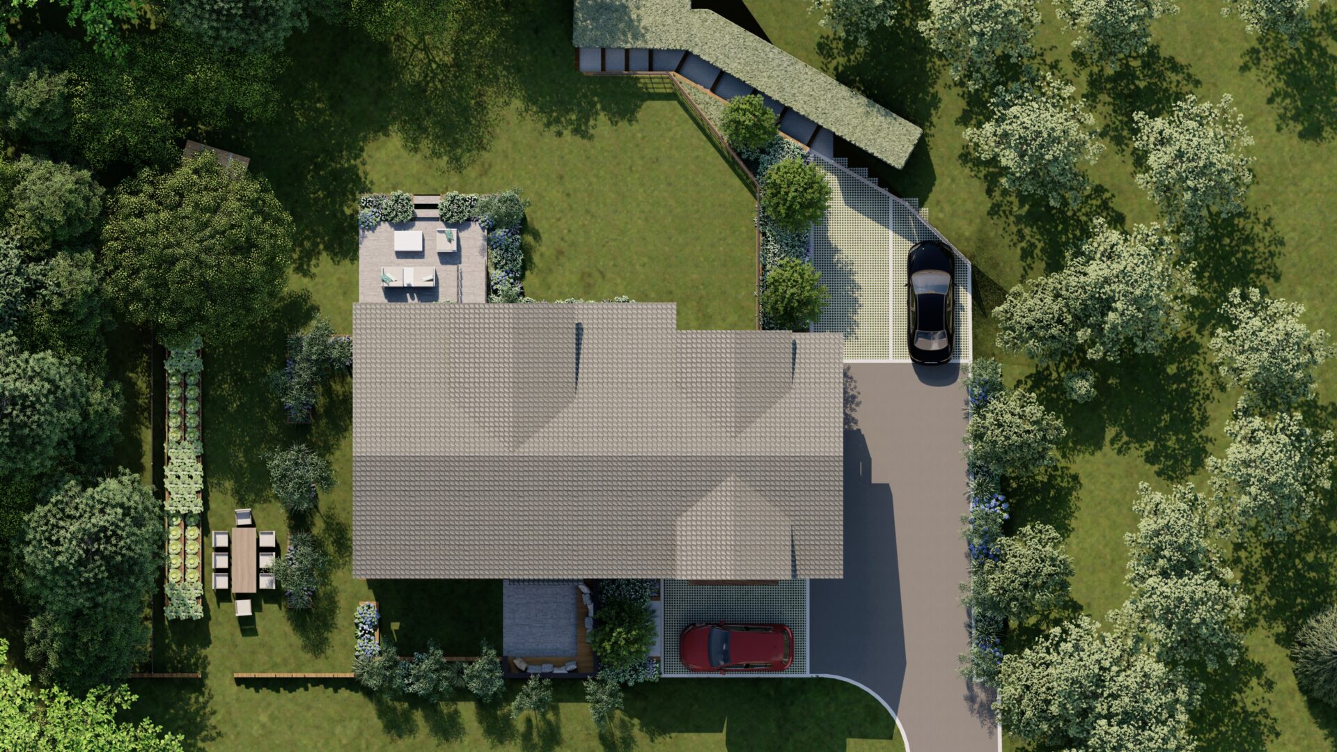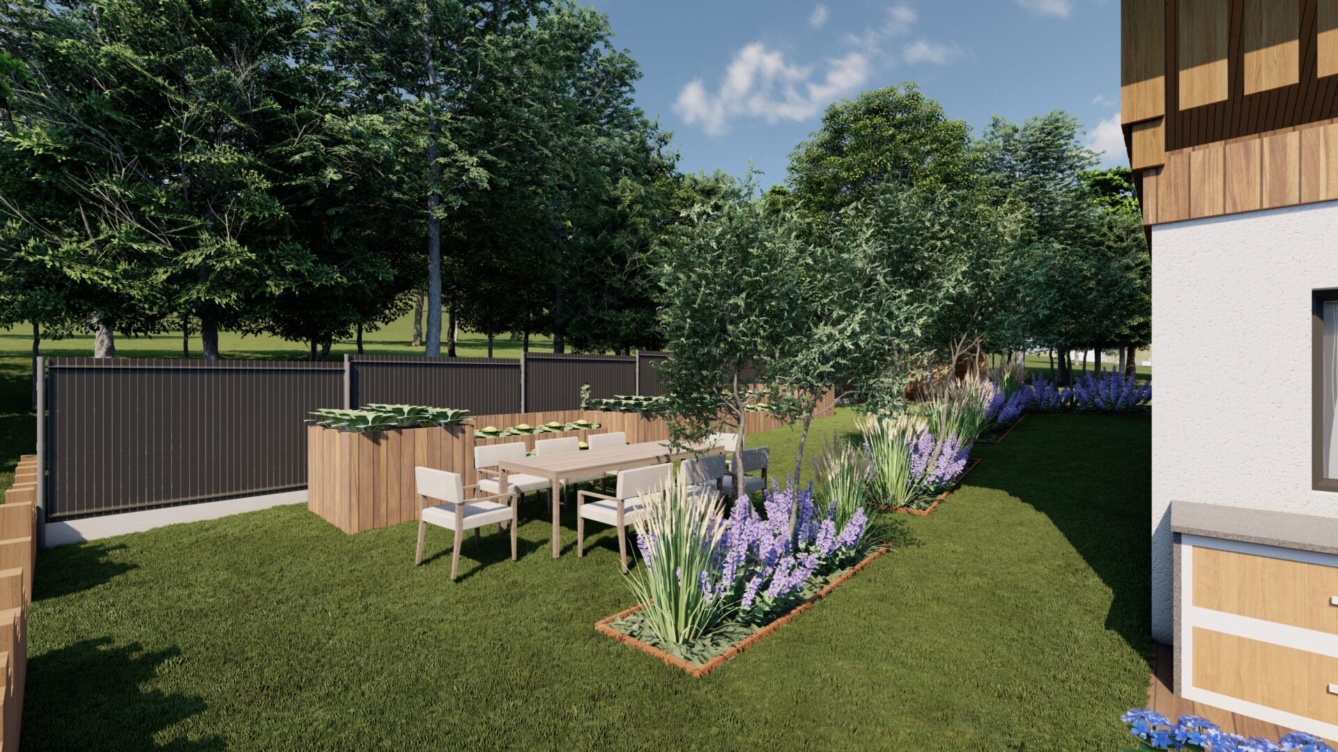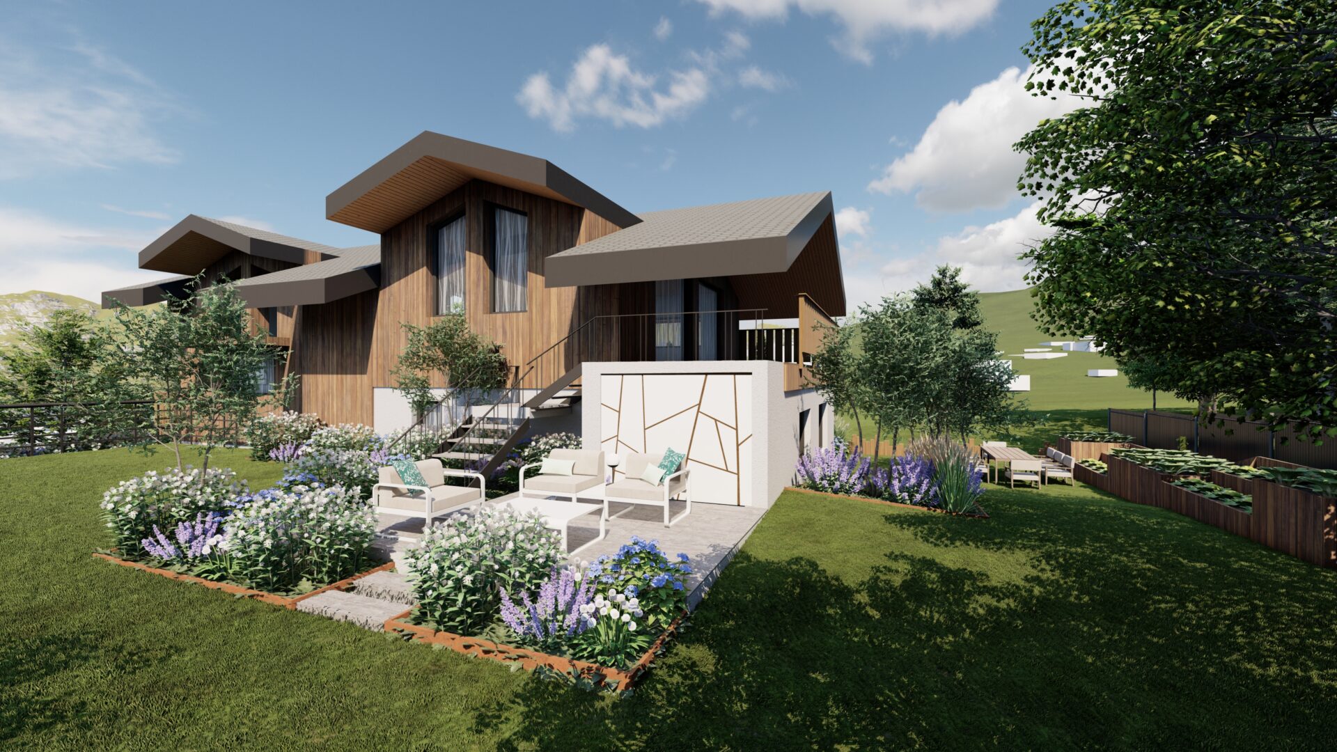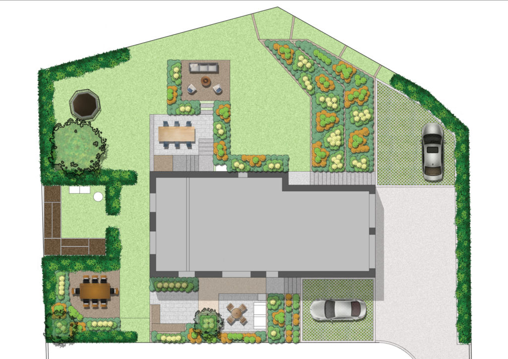 Cette composition permet de concilier intimité et convivialité, en offrant à chacun des espaces distincts tout en créant un cœur de jardin fédérateur. La zone centrale, articulée autour d’un potager et d’un espace repas, devient ainsi un véritable lieu de vie commun, propice aux échanges et aux moments partagés.