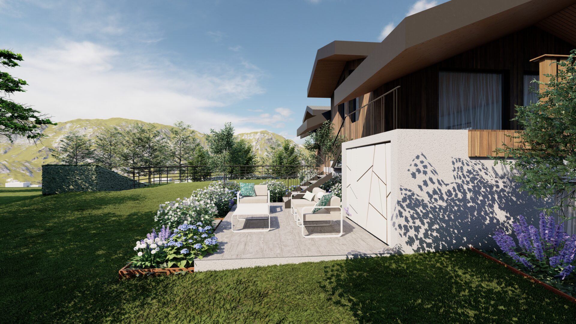 Les terrasses et assises intégrées prolongent les usages extérieurs, tandis que la palette végétale, mêlant vivaces et graminées, apporte cohérence, légèreté et saisonnalité à l’ensemble.