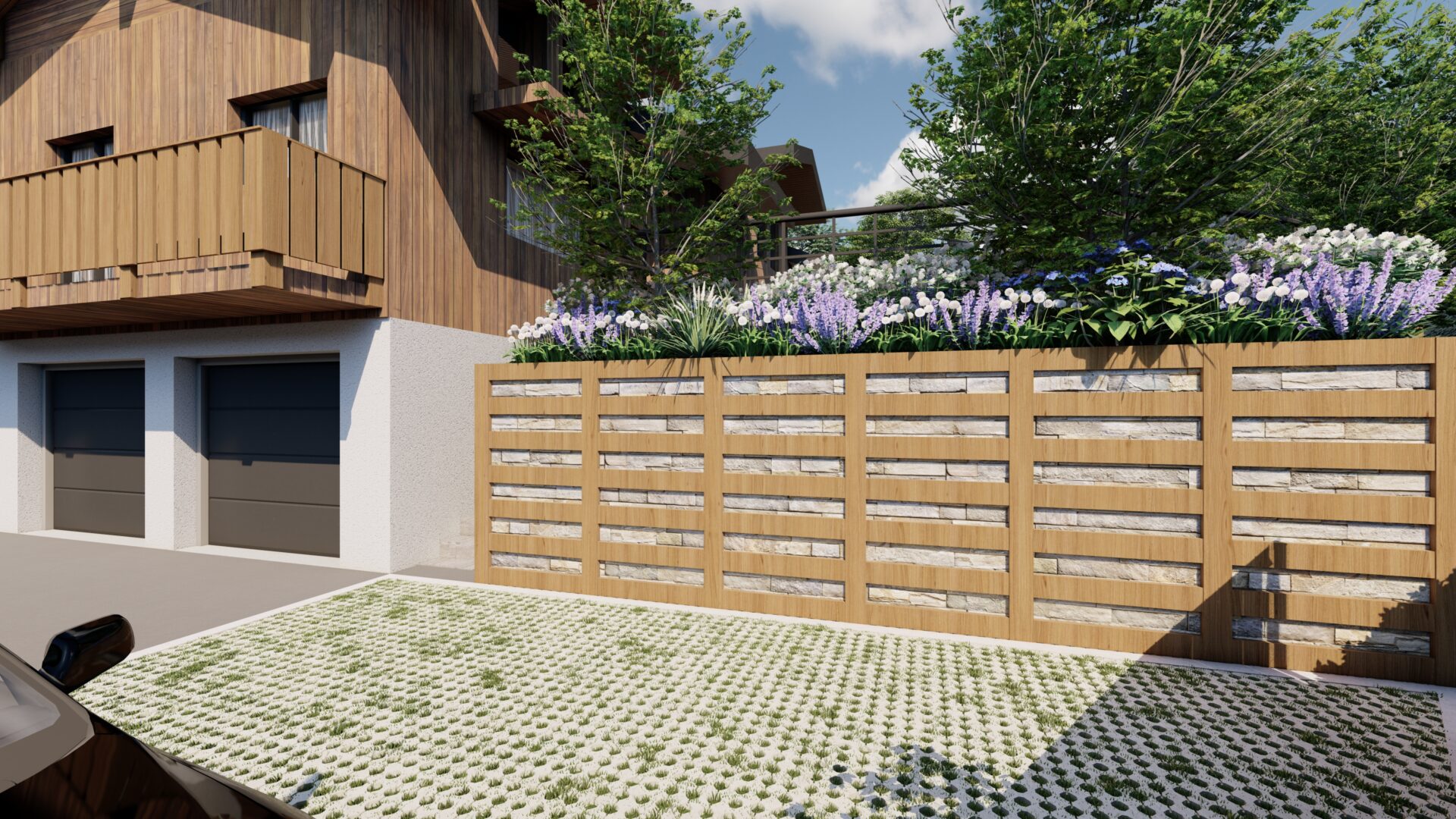 Les aménagements accompagnent cette organisation par des transitions paysagères douces : les plantations viennent structurer les limites sans les figer, créant des filtres visuels qui préservent.