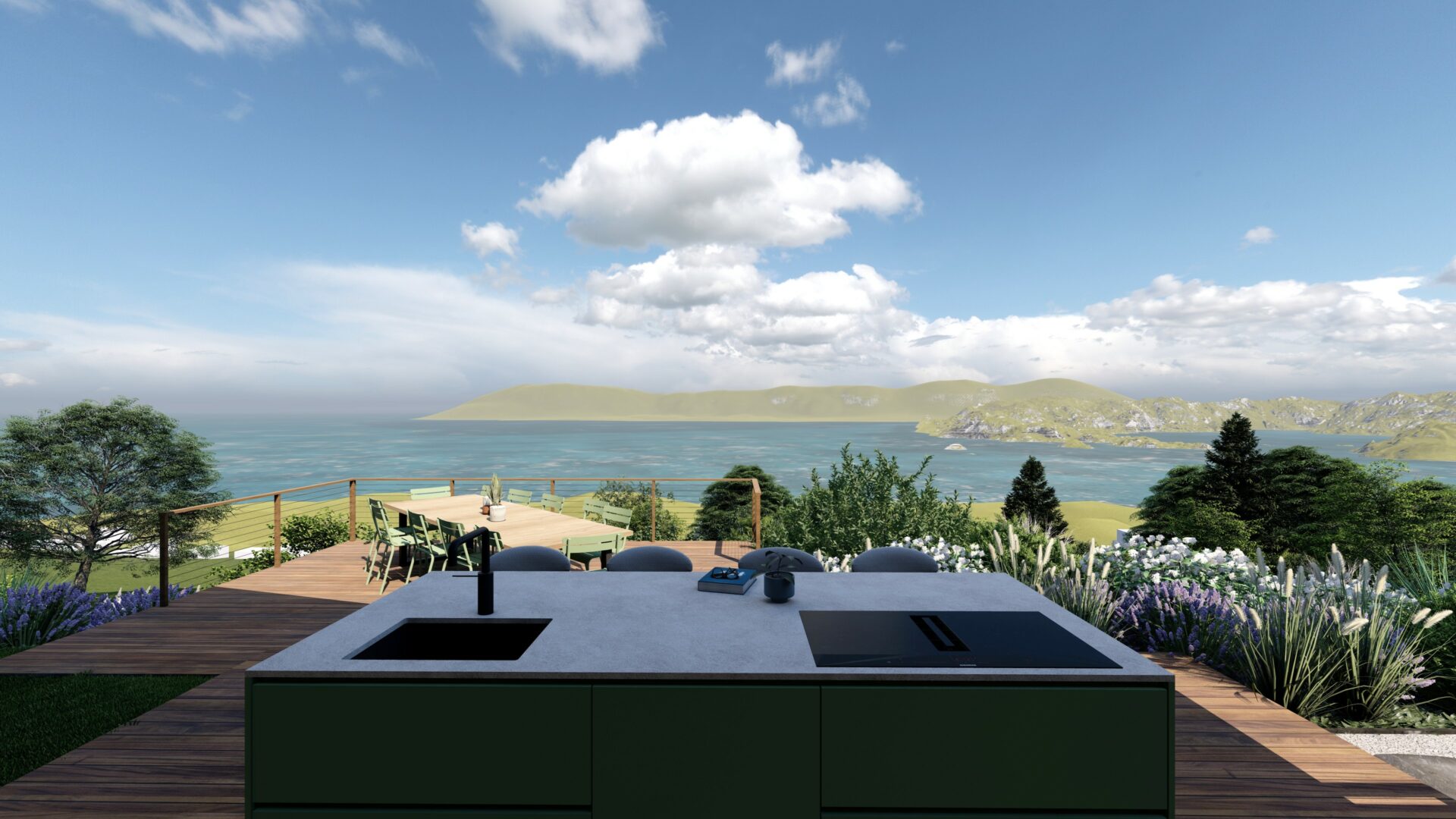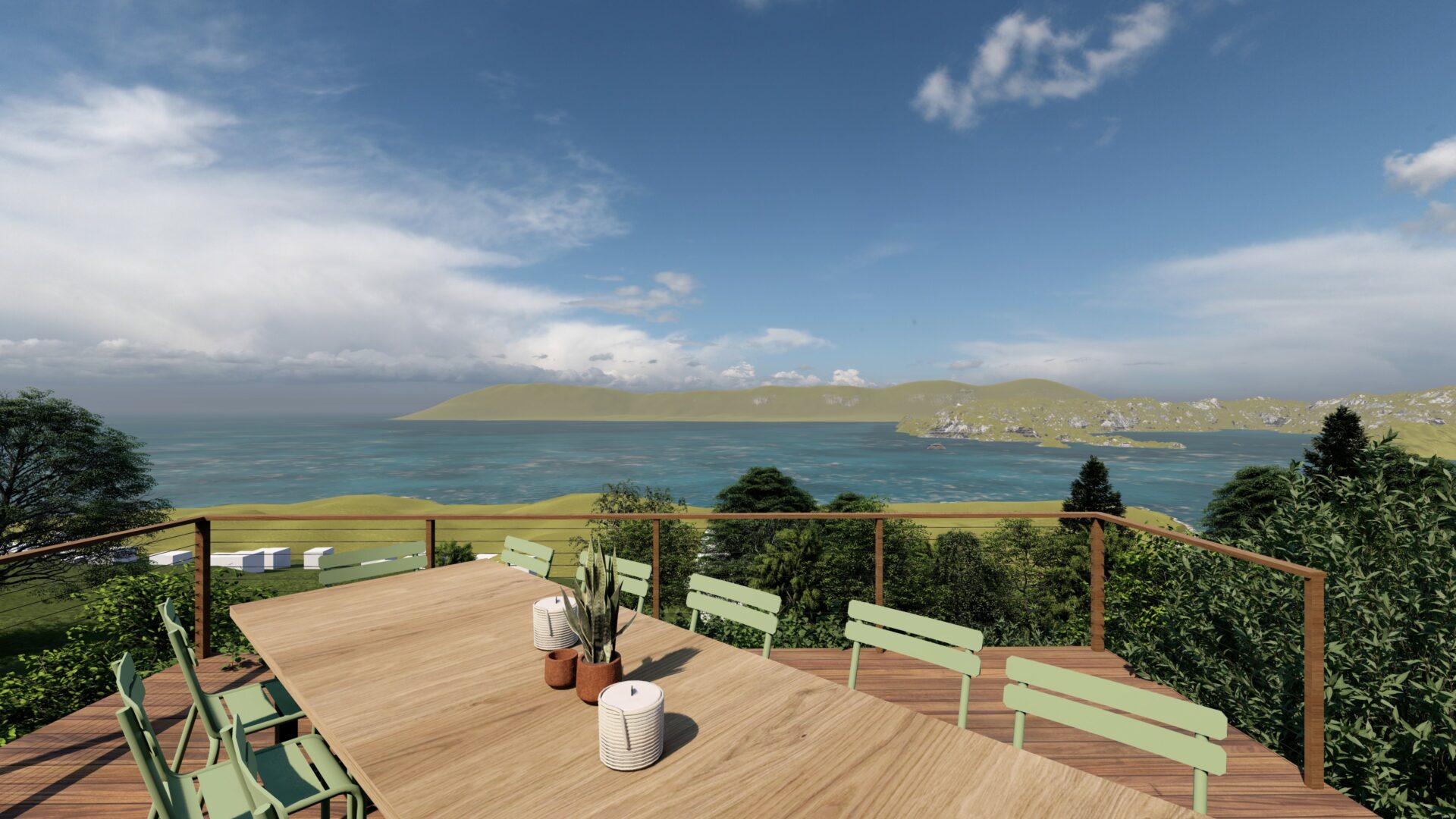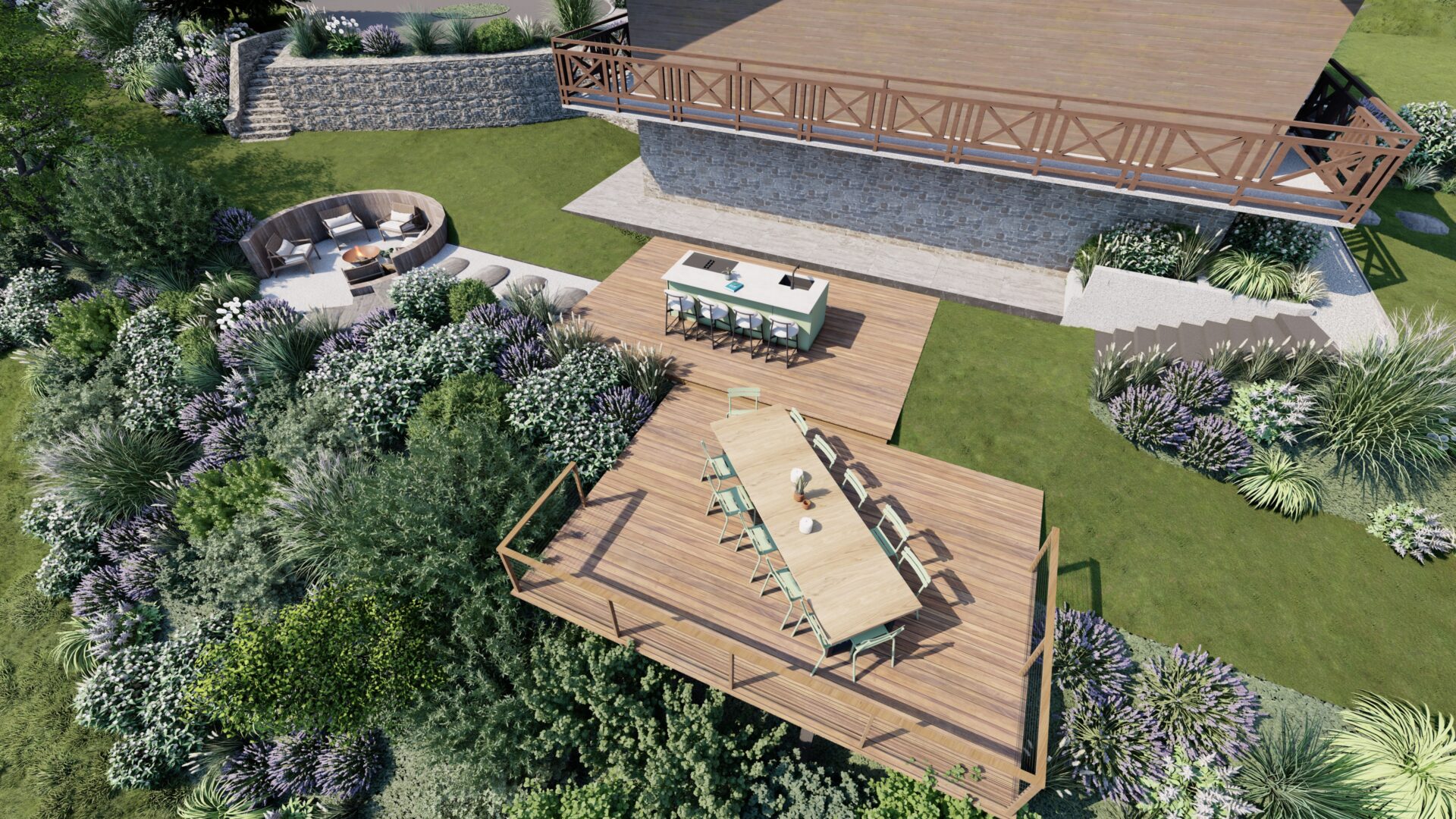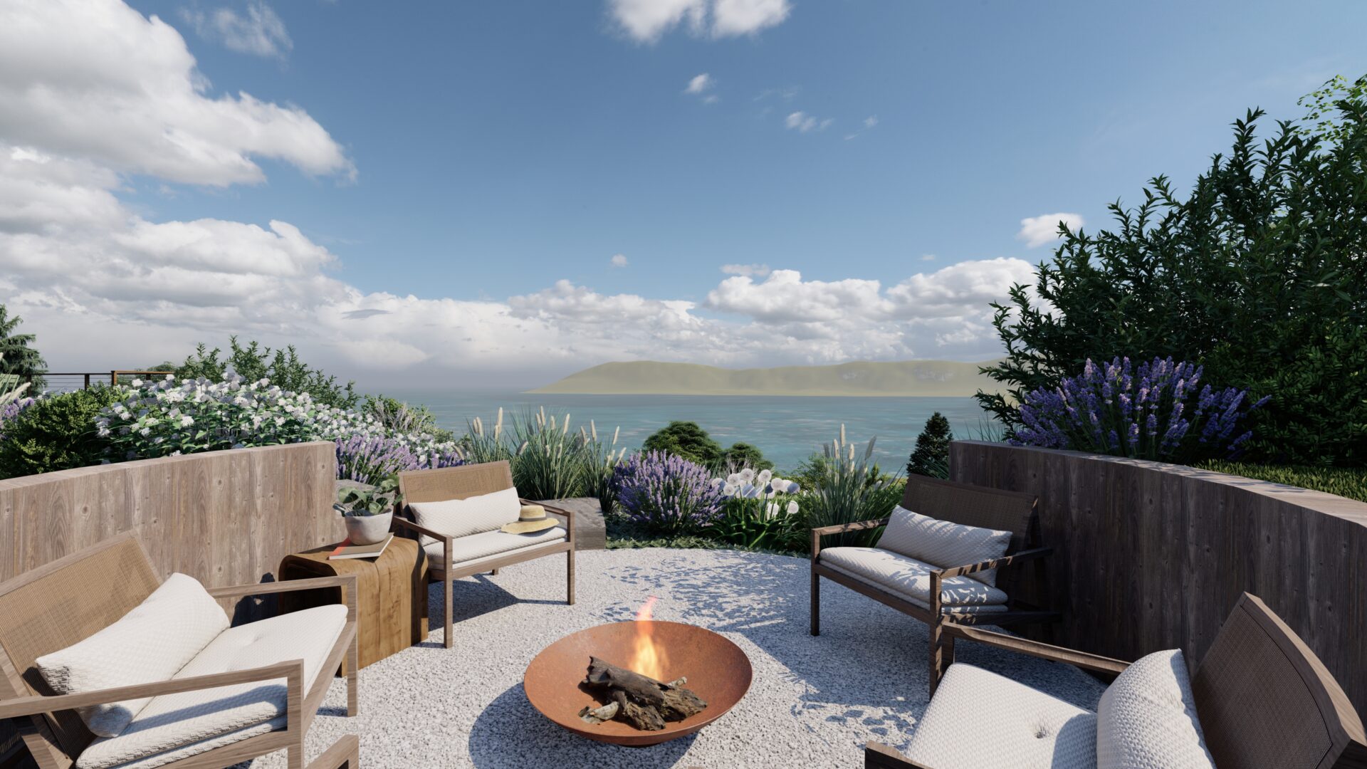 Au cœur du projet, une grande terrasse en bois accueille les moments de convivialité avec une cuisine extérieure et un espace repas généreux, ouvert sur l’horizon. En contrebas, des espaces plus intimistes prennent place, comme un salon creusé autour d’un brasero offrant une expérience immersive face au paysage.