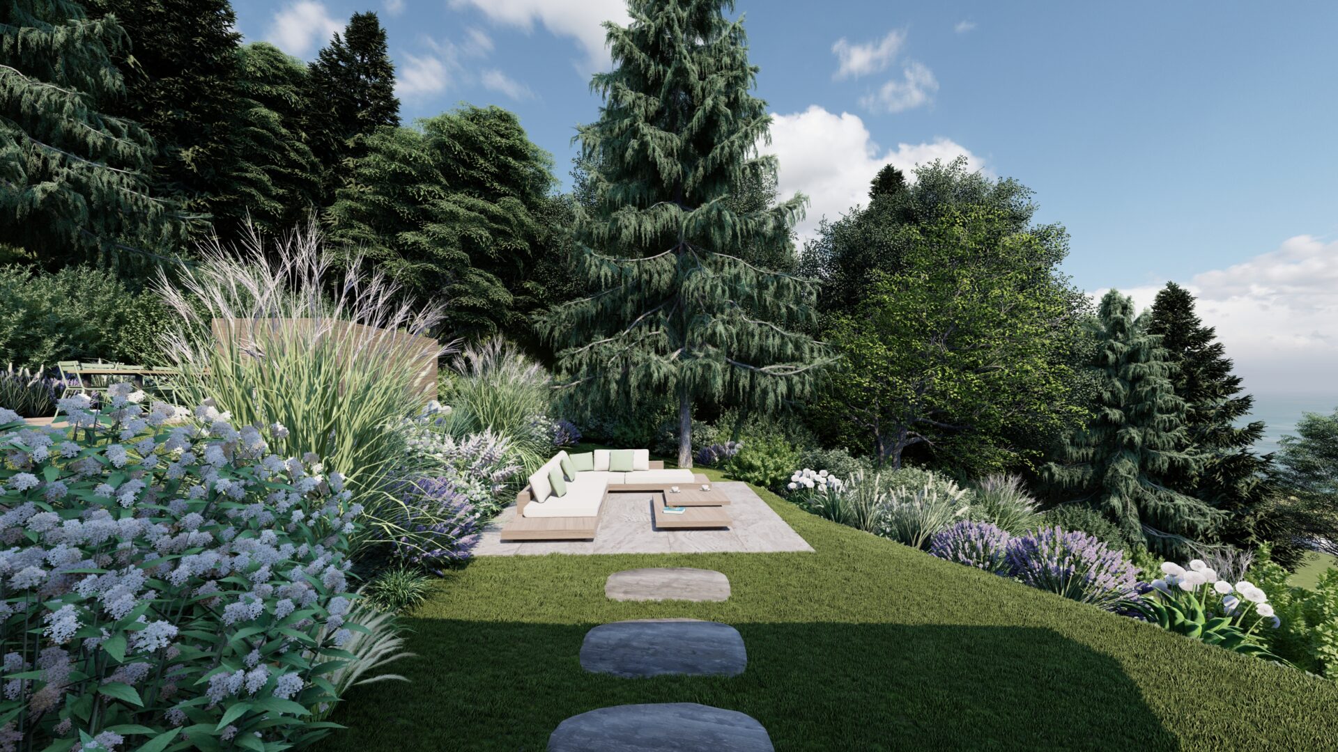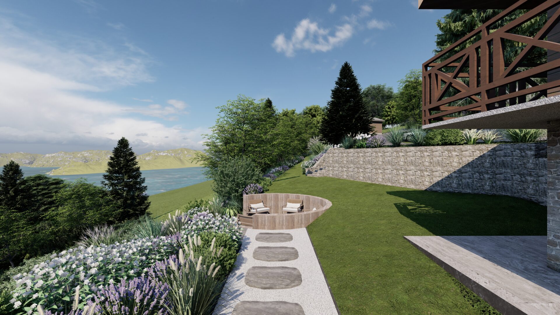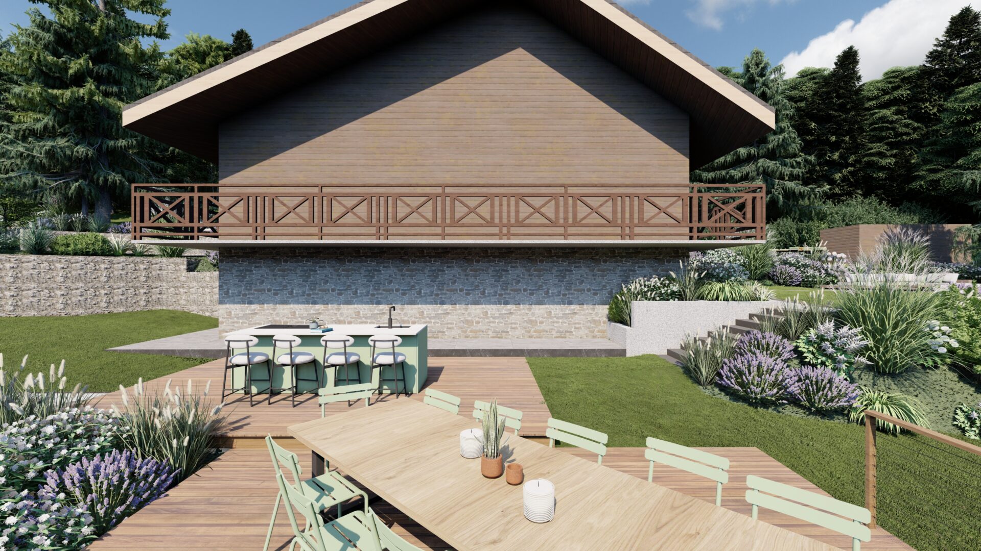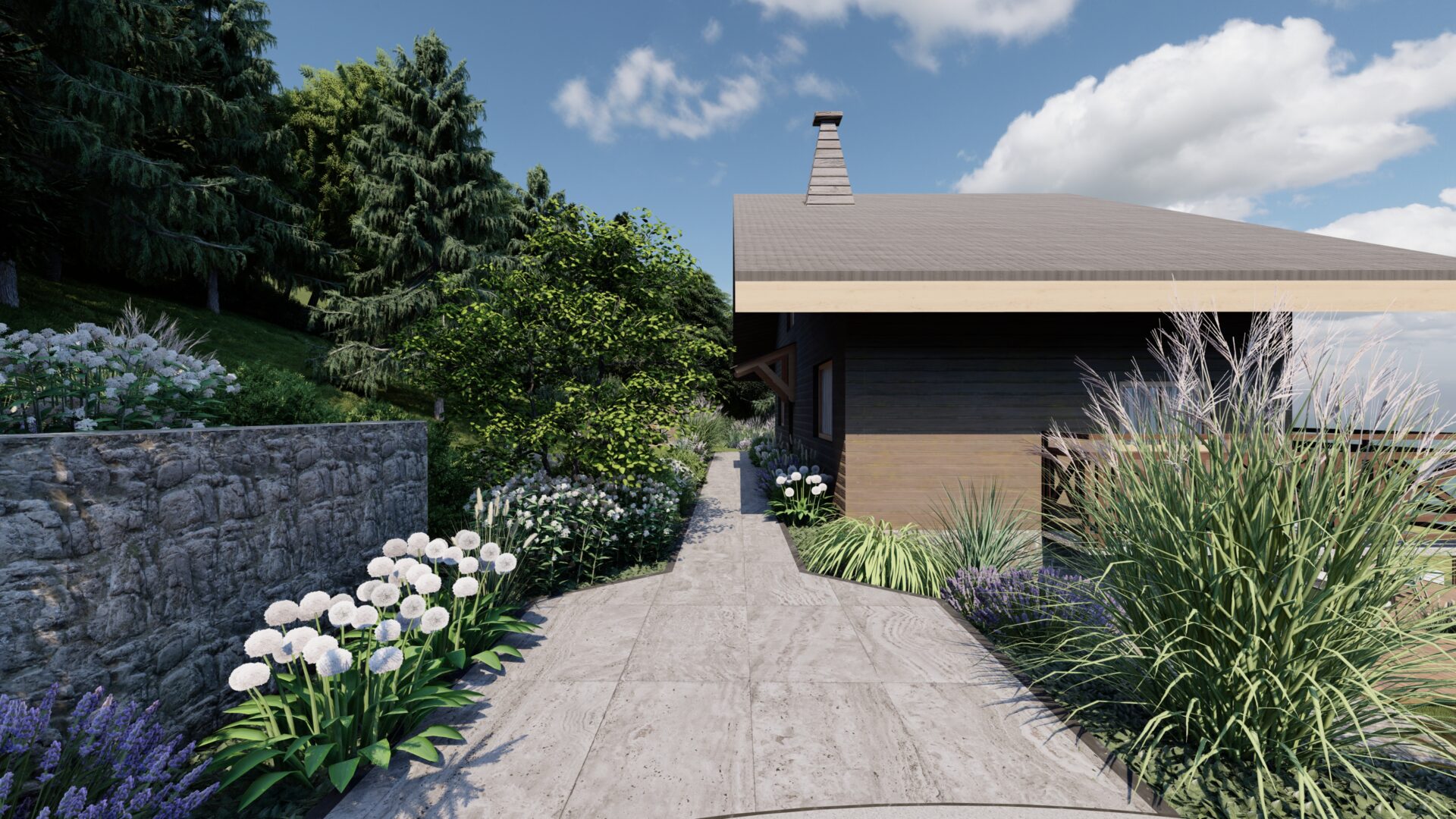 Le végétal accompagne chaque transition, avec une palette douce et naturelle mêlant graminées, vivaces et arbustes, créant une ambiance à la fois contemporaine et chaleureuse. Les matériaux, sobres et durables, dialoguent avec l’architecture du chalet et renforcent l’ancrage du projet dans son environnement montagnard.