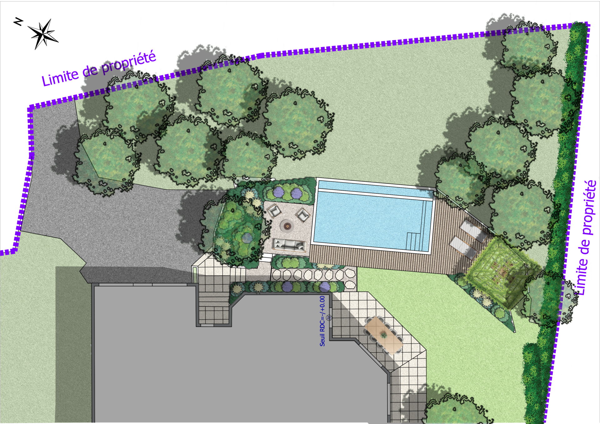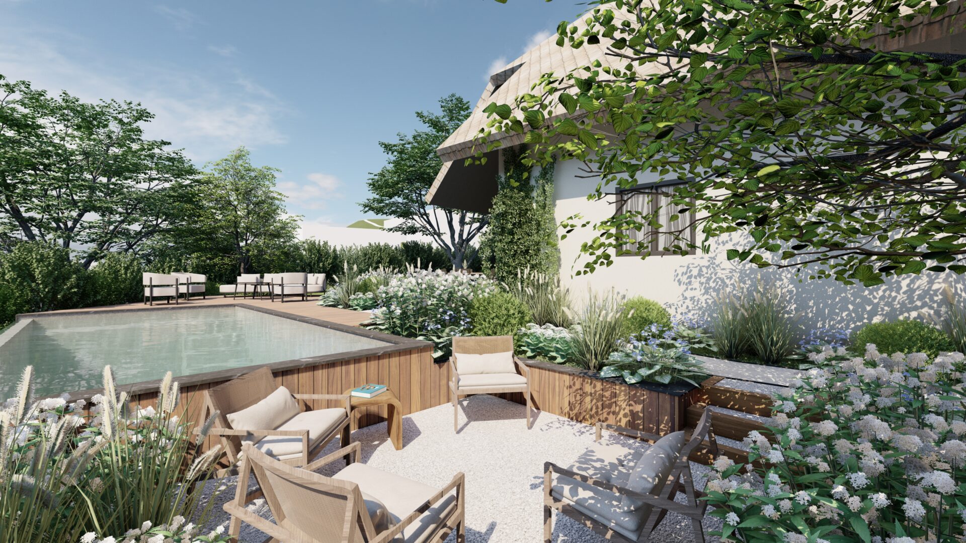 Les différents espaces de vie ; Terrasse repas, salon extérieur et espace détente plus intimiste s’articulent autour du bassin afin de proposer des ambiances variées au fil de la journée. Une palette végétale douce et naturelle, mêlant graminées, vivaces et arbustes, accompagne les cheminements et enveloppe les espaces de détente pour créer un jardin vivant, léger et intégré à son environnement.