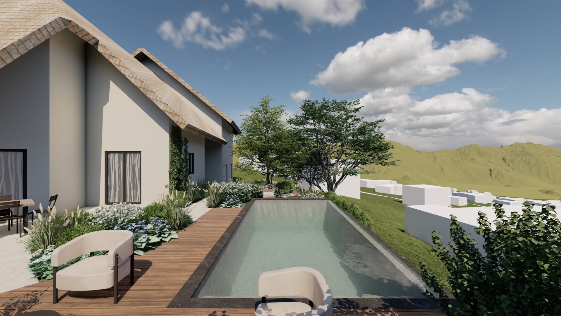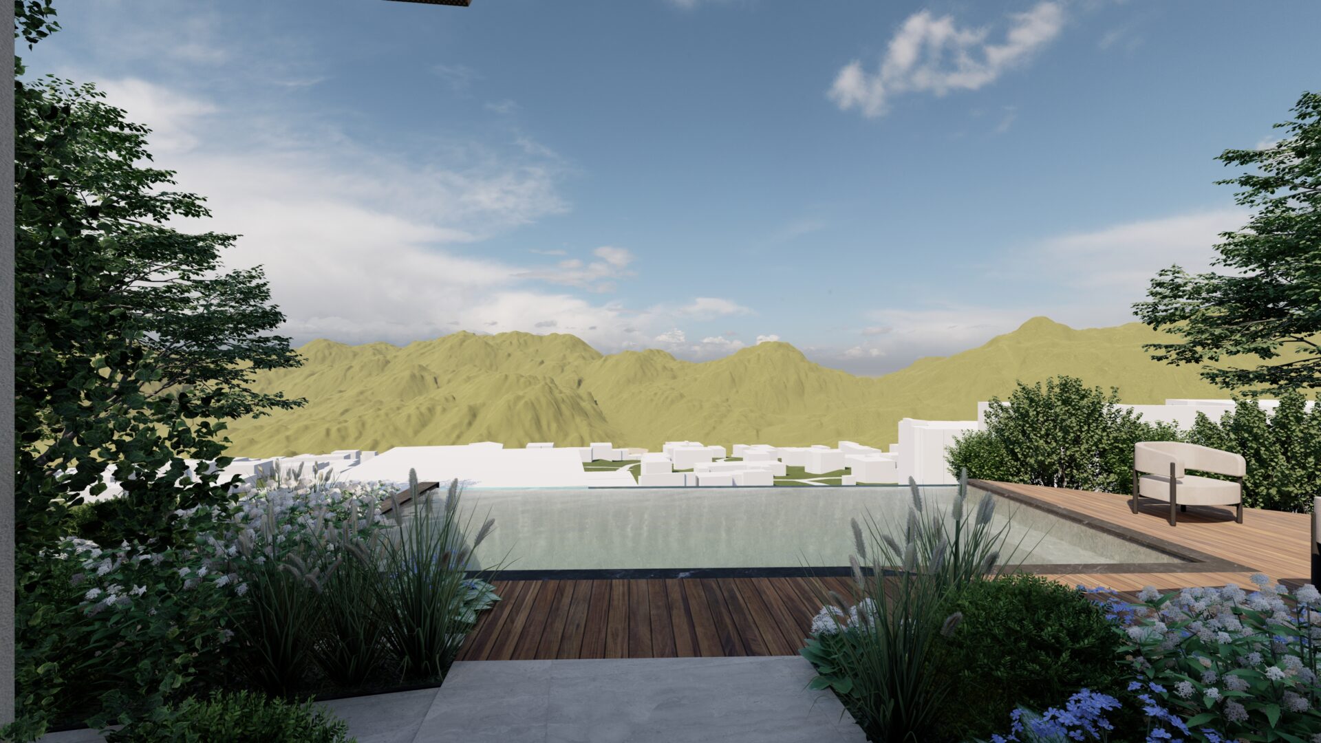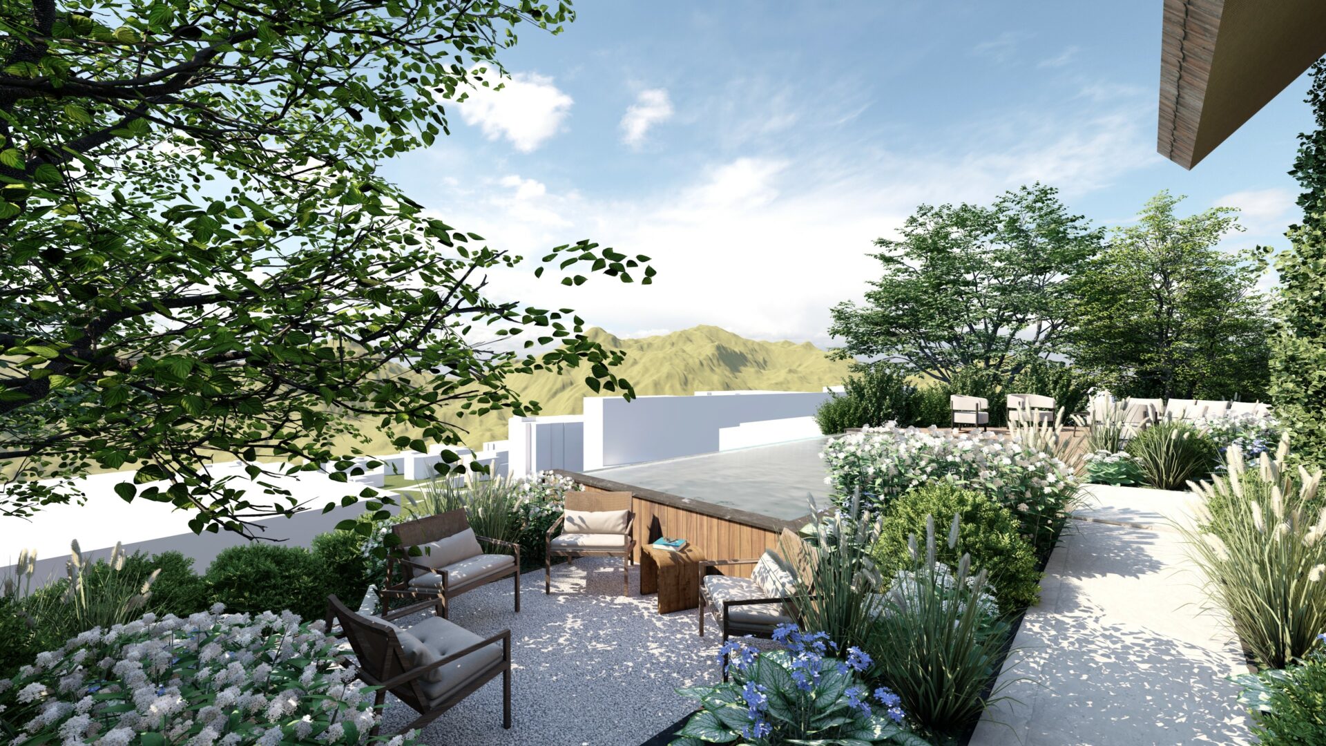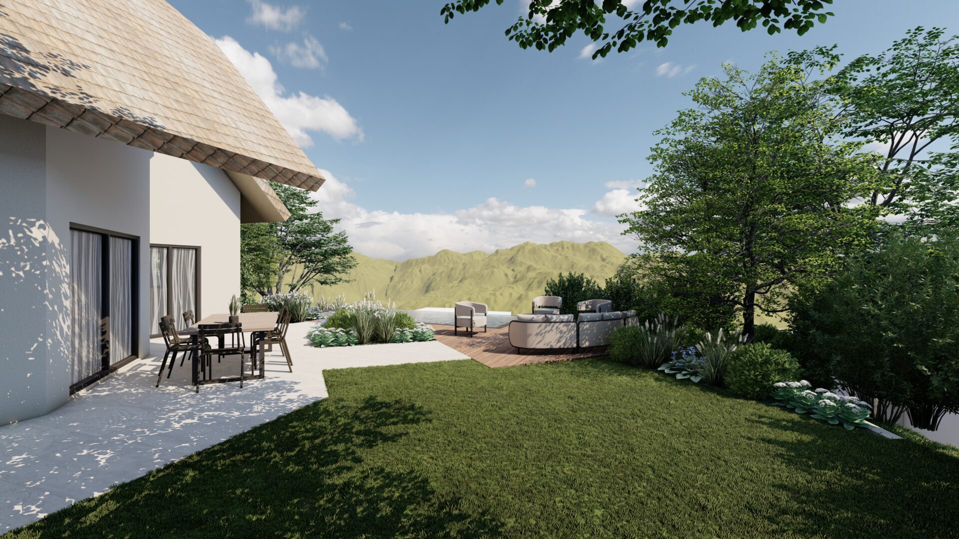 Le projet s’inscrit dans une volonté de révéler pleinement le potentiel du site en mettant en scène les vues lointaines sur le paysage environnant. L’aménagement s’organise autour d’une piscine à débordement, pensée comme une ligne d’horizon qui prolonge visuellement le jardin vers les montagnes.
