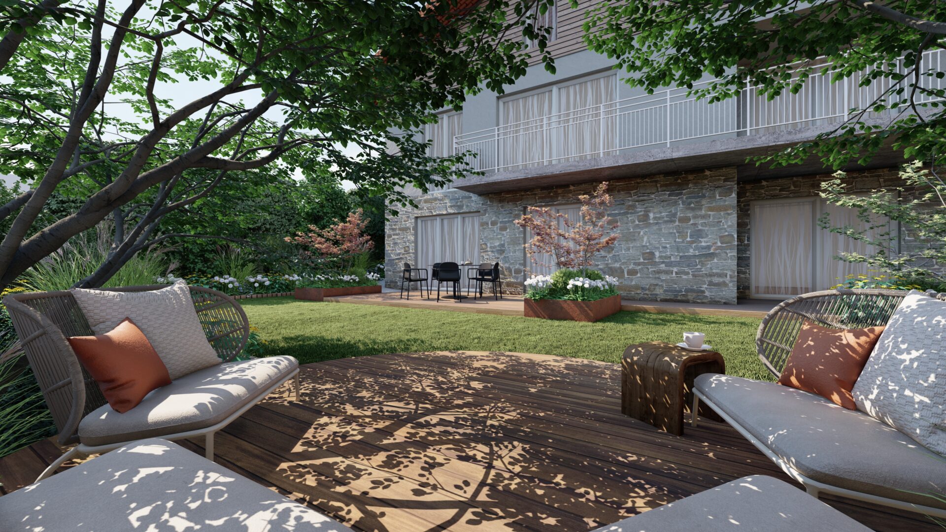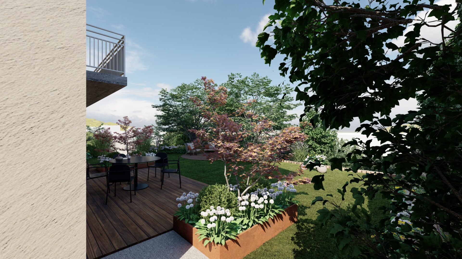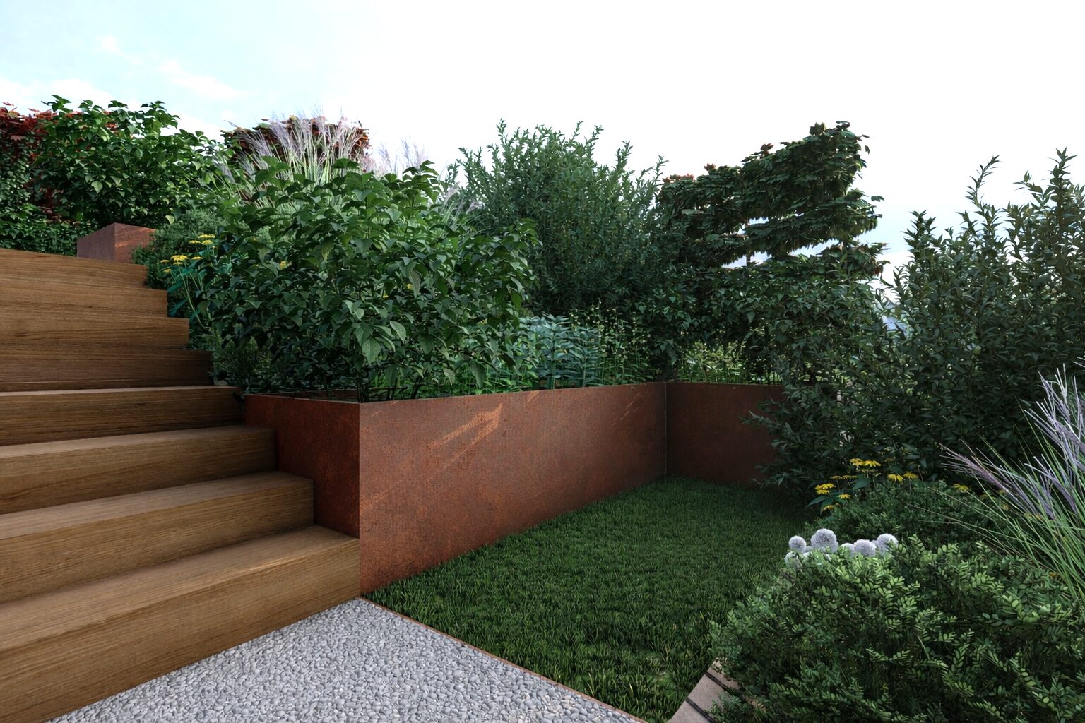 En partie basse, le jardin se fait plus enveloppant. Les massifs plantés, denses et stratifiés, dessinent des cocons d’intimité protégés du voisinage. Le dialogue entre les matériaux : la chaleur du bois, le caractère de l’acier Corten et la noblesse de la pierre ancre la réalisation dans une écriture contemporaine et pérenne.