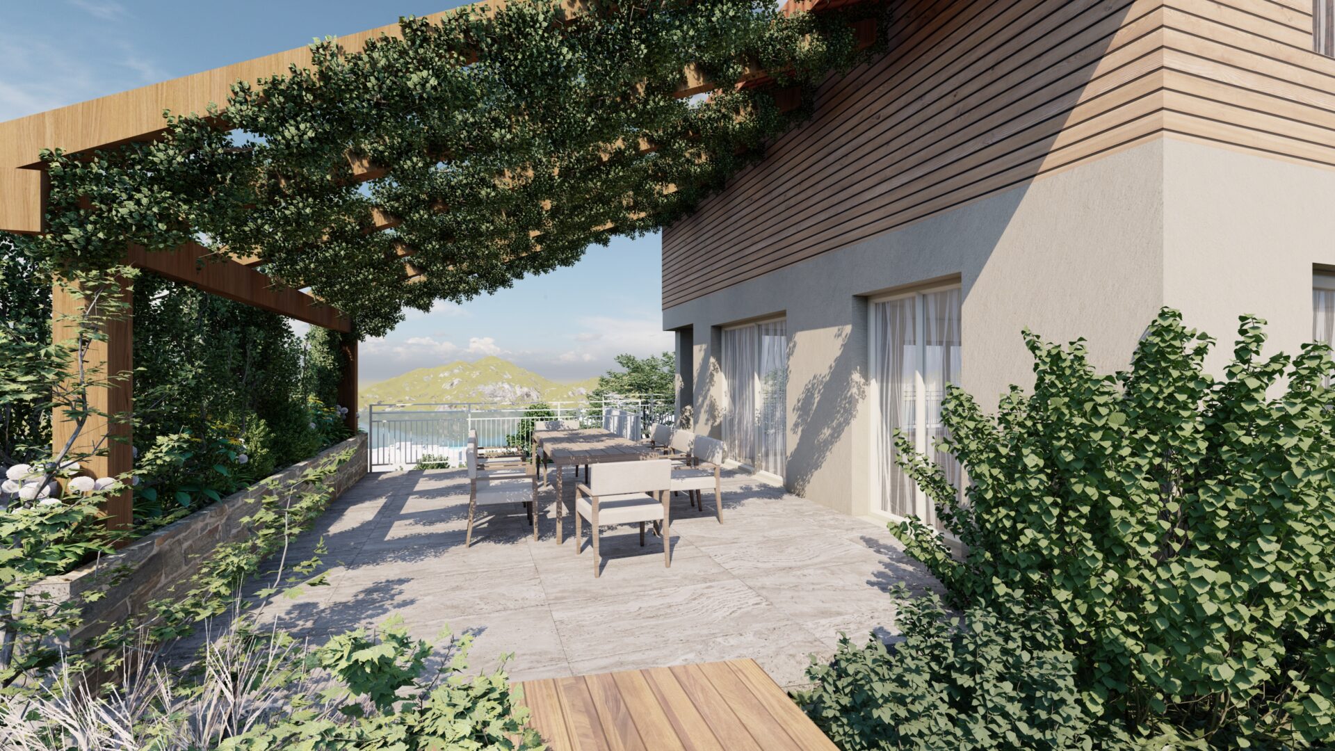 À l’étage, la terrasse principale s’affirme comme le cœur battant du jardin. Sa pergola généreusement végétalisée filtre la lumière pour créer une atmosphère douce, tout en cadrant les vues vers le grand paysage.